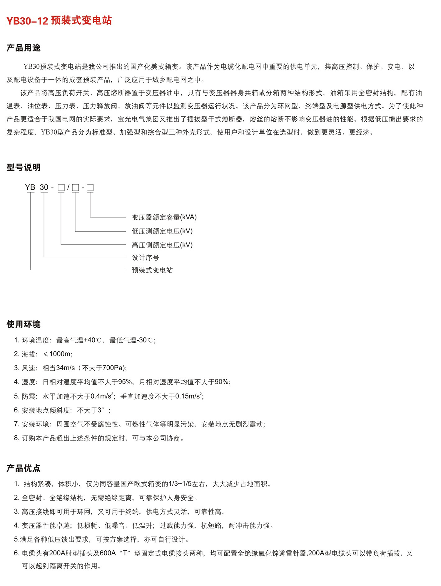 YB30预装式变电站是我公司推出的国产化美式箱变。该产品作为电缆化配电网中重要的供电单元,集高压控制、保护、变电、以及配电设备于一体的成套预装产品,广泛应用于城乡配电网之中。