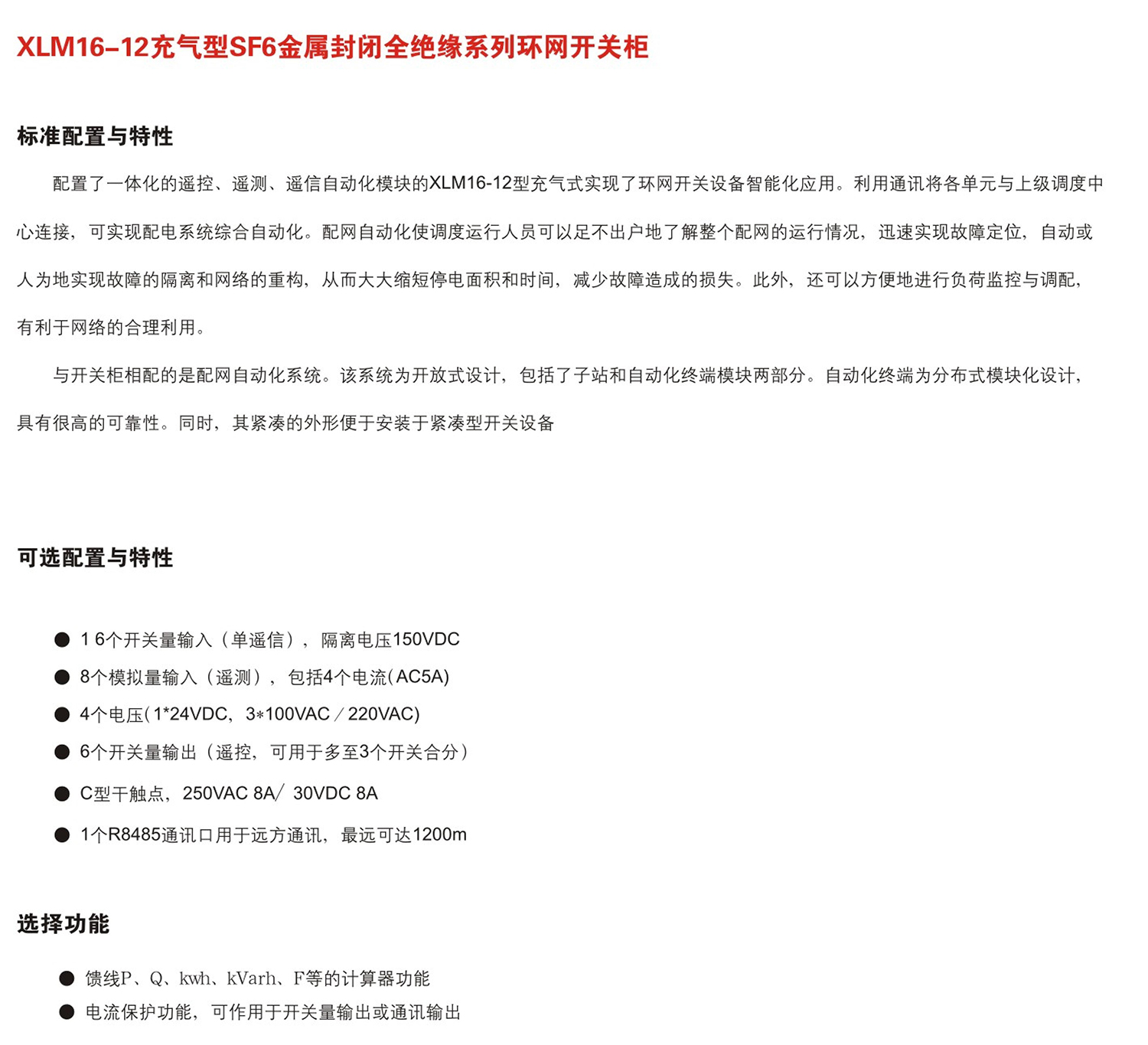 配置了一体化的遥控、遥测、遥信自动化模块的XLM16-12型充气式实现了环网开关设备智能化应用。利用通讯将各单元与上级调度中心连接,可实现配电系统综合自动化。配网自动化使调度运行人员可以足不出户地了解整个配网的运行情况,迅速实现故障定位,自动或人为地实现故障的隔离和网络的重构,从而大大缩短停电面积和时间,减少故障造成的损失。此外,还可以方便地进行负荷监控与调配,有利于网络的合理利用。