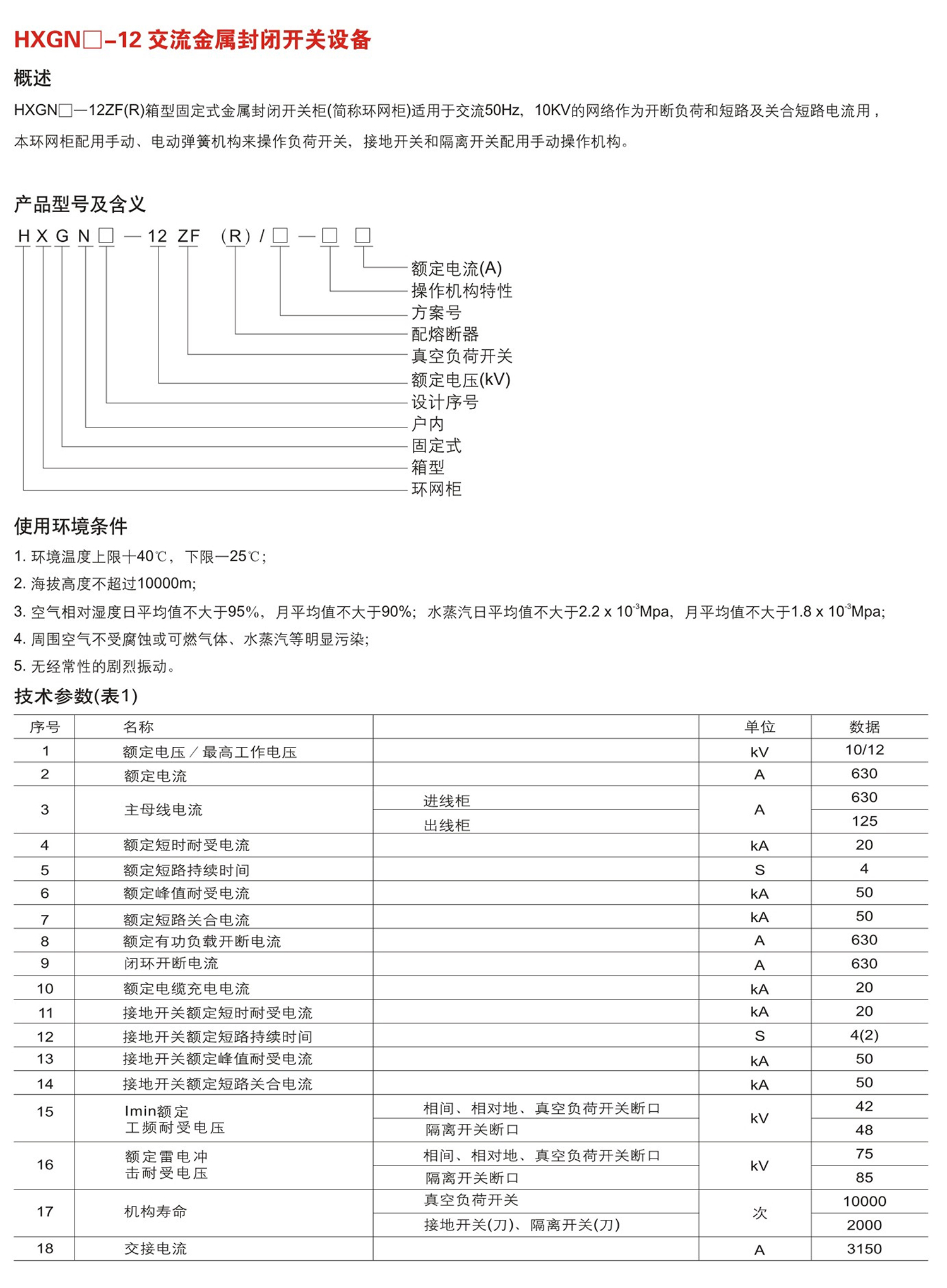 HXGN☐一12ZF(R)箱型固定式金属封闭开关柜(简称环网柜)适用于交流50Hz,10KV的网络作为开断负荷和短路及关合短路电流用,本环网柜配用手动、电动弹簧机构来操作负荷开关,接地开关和隔离开关配用手动操作机构。