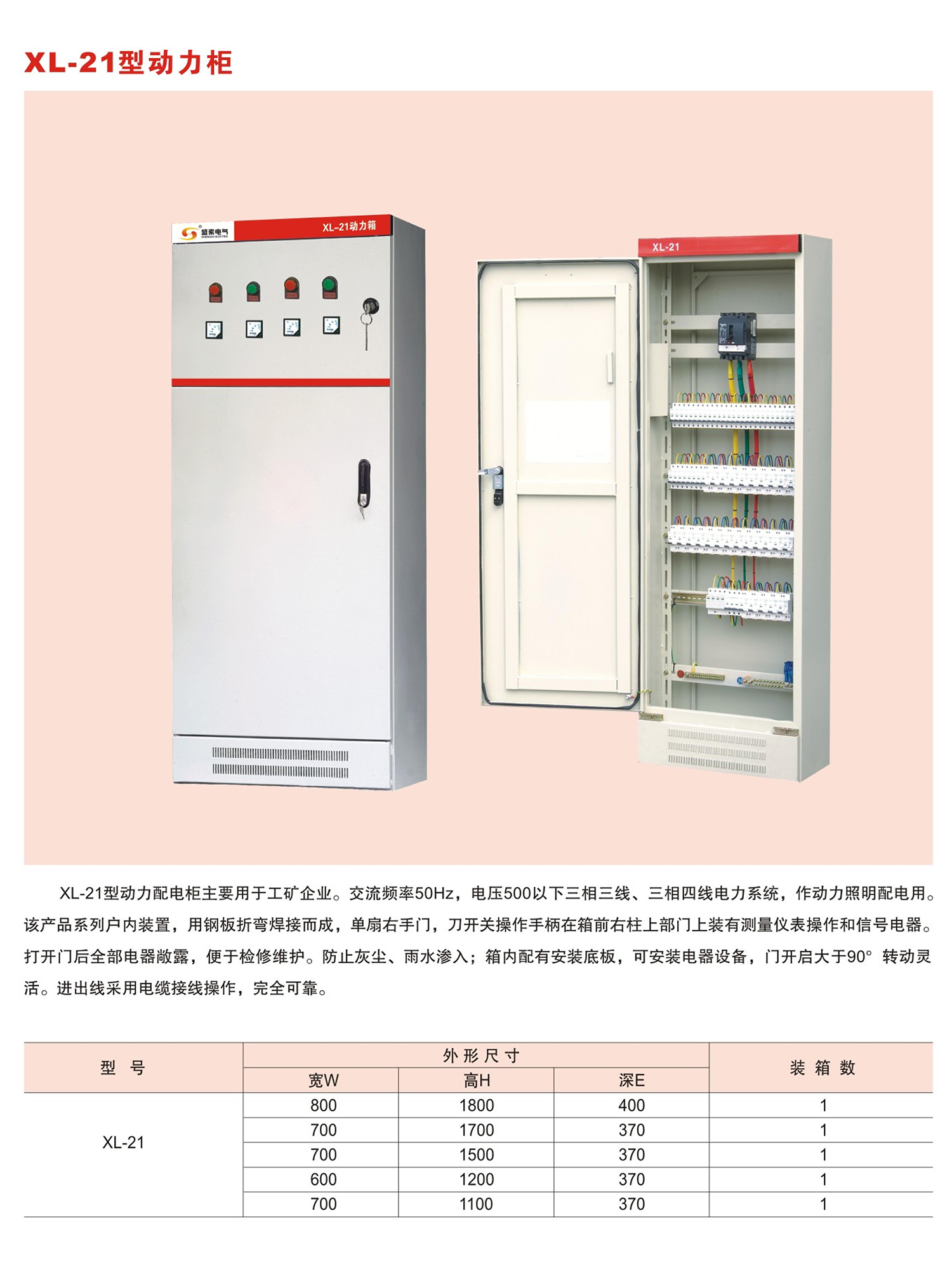 XL-21型动力配电柜主要用于工矿企业。交流频率50Hz,电压500以下三相三线、三相四线电力系统,作动力照明配电用。该产品系列户内装置,用钢板折弯焊接而成,单扇右手门,刀开关操作手柄在箱前右柱上部门上装有测量仪表操作和信号电器。打开门后全部电器敞露,便于检修维护。防止灰尘、雨水渗入;箱内配有安装底板,可安装电器设备,门开启大于90°转动灵活。进出线采用电缆接线操作,完全可靠。