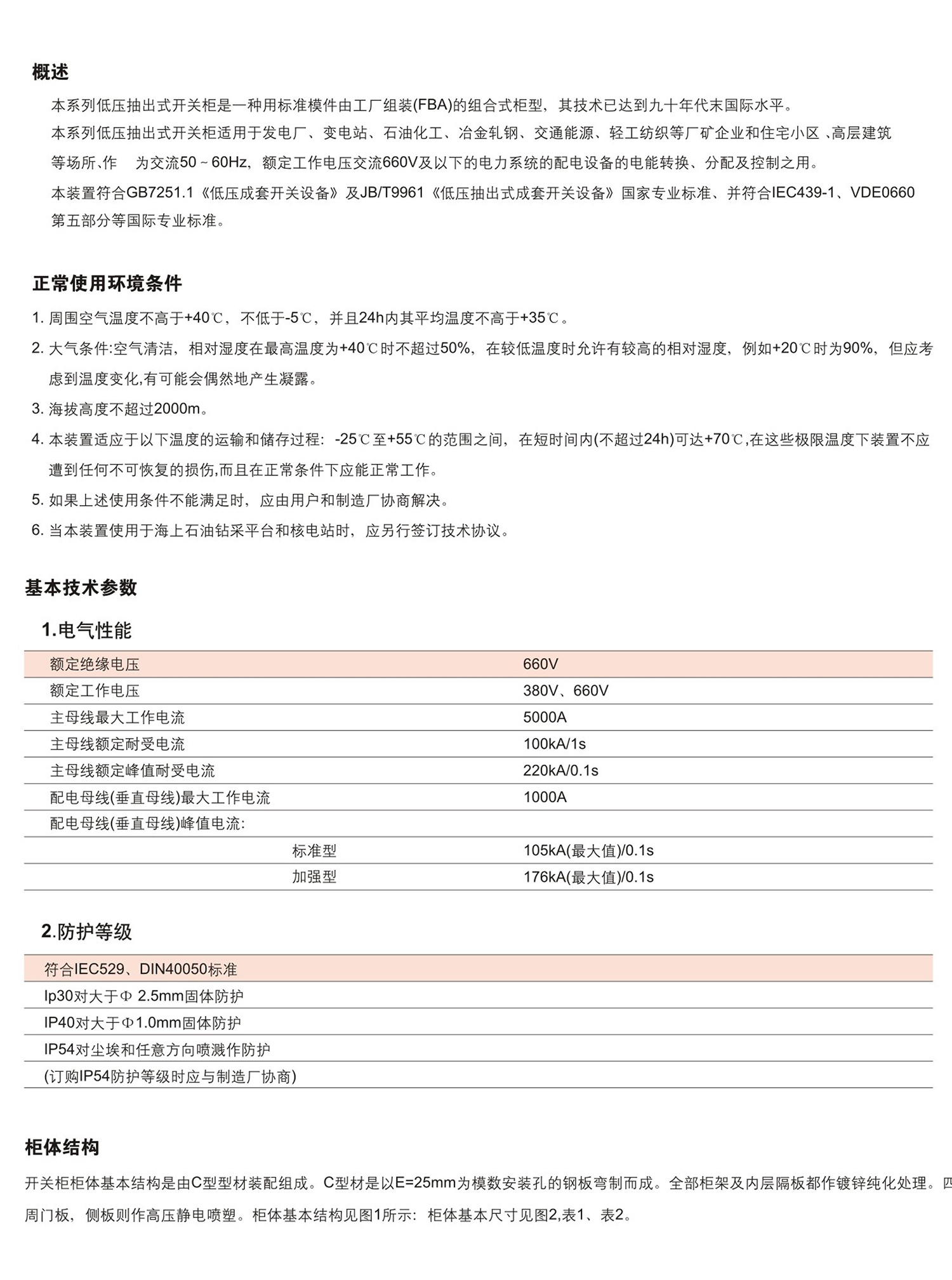 本系列低压抽出式开关柜是一种用标准模件由工厂组装(FBA)的组合式柜型,其技术已达到九十年代末国际水平。本系列低压抽出式开关柜适用于发电厂、变电站、石油化工、冶金轧钢、交通能源、轻工纺织等厂矿企业和住宅小区、高层建筑等场所、作为交流50~60Hz,额定工作电压交流660V及以下的电力系统的配电设备的电能转换、分配及控制之用。本装置符合GB7251.1《低压成套开关设备》及JB/T9961《低压抽出式成套开关设备》国家专业标准、并符合EC439-1、VDE0660第五部分等国际专业标准。