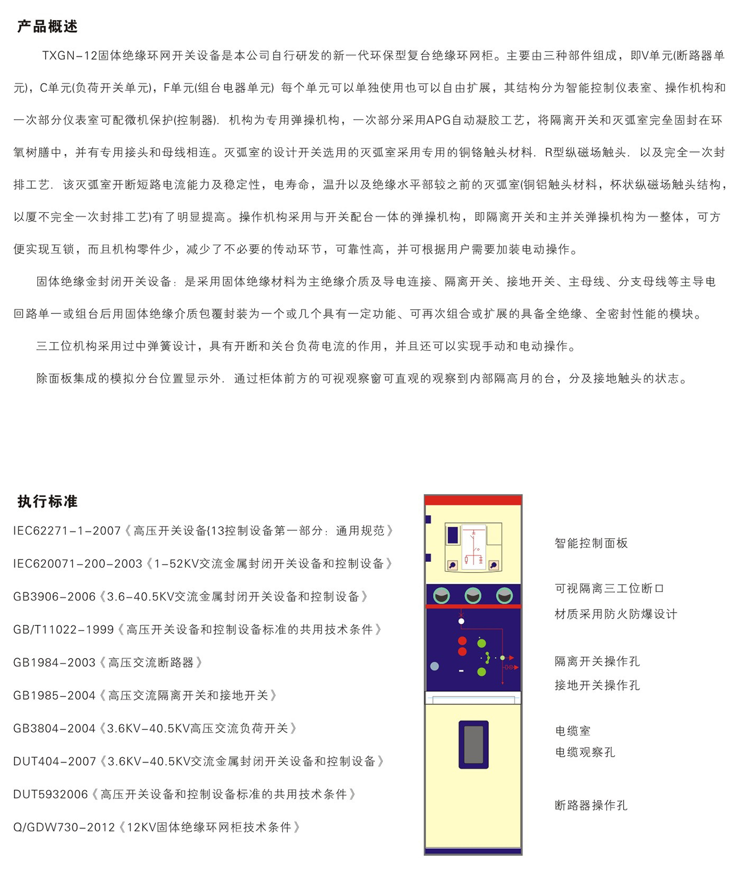 TXGN-12固体绝缘环网开关设备是本公司自行研发的新一代环保型复台绝缘环网柜。主要由三种部件组成,即V单元(断路器单元),C单元(负荷开关单元),F单元(组台电器单元)每个单元可以单独使用也可以自由扩展,其结构分为智能控制仪表室、操作机构和一次部分仪表室可配微机保护(控制器).机构为专用弹操机构,一次部分采用APG自动凝胶工艺,将隔离开关和灭弧室完垒固封在环氧树膳中,并有专用接头和母线相连。灭弧室的设计开关选用的灭弧室采用专用的铜铬触头材料.R型纵磁场触头.以及完全一次封排工艺.该灭弧室开断短···